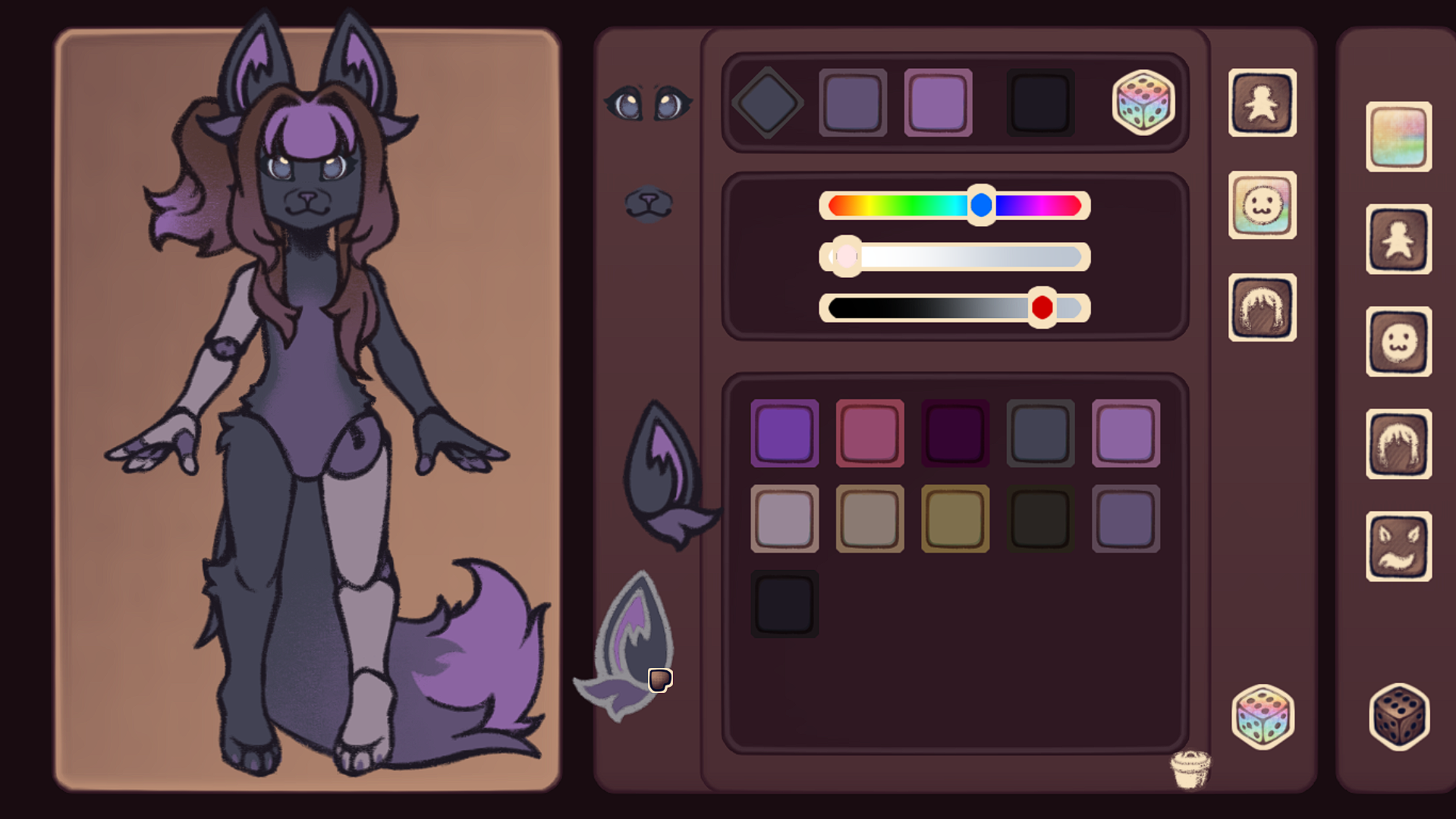 You can disable symmetry for the body (all body parts, ears and tail), eyes and hair. This will allow you to edit each detail separately.